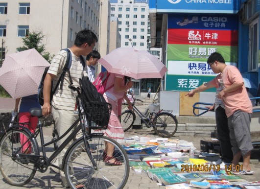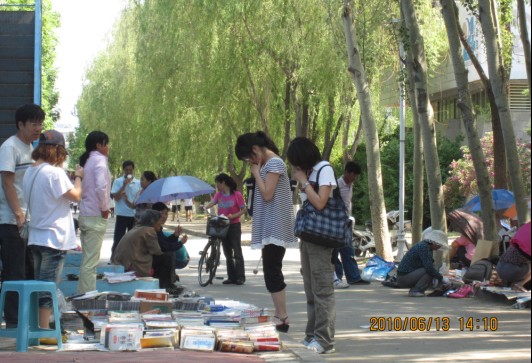 依惯例,从五月末开始到毕业,每周六、周日是吉大毕业生跳蚤市场开放的日子。毕业生们在学校生活区内精心选址、备齐水粮、摆开摊位、拉开阵势,专业书、考级题、课外读物、音像制品、衣包鞋帽、盆碗饰物……可谓应有尽有。采访中,记者了解到,答辩刚刚结束,很多人都沉浸在放松、平和的状态之中,来跳蚤市场,一方面是给即将毕业的行囊“减肥”,处理一些无法带走的书籍用品,更重要的是在跳蚤市场感受那种特殊的气氛——和卖书同学一起聊天、打牌,尽情放松,享受毕业时节这段短暂的在一起无忧无虑的快乐时光;和买书的师弟师妹攀谈,交流关于自己熟悉的那些课程、那些老师们的点点滴滴,是倾诉也是回忆……这本身就是毕业的一抹别样色彩,佳期不复,失而难得。